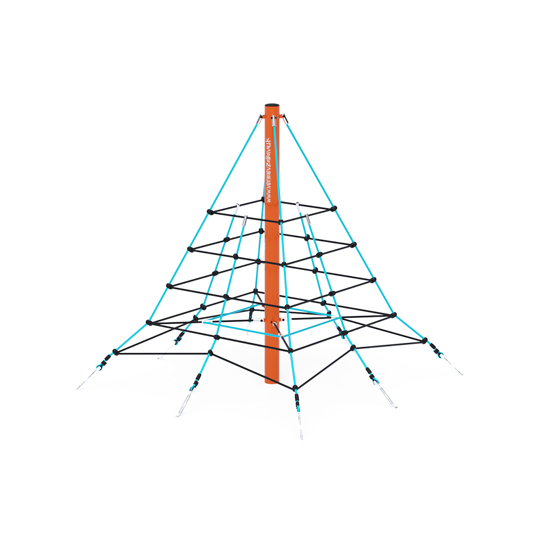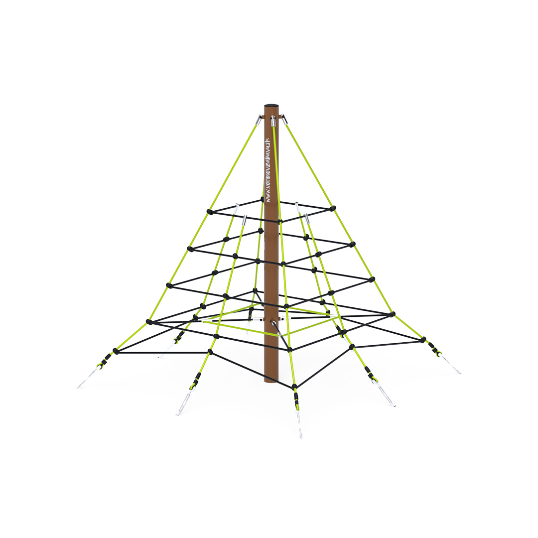 Dvojmetrová lanová pyramída je vhodná aj pre menšie deti, ktoré isto naberú odvahu vyliezť až na vrchol. Herný prvok je vyrobený zo zinkovanej ocele s kvalitnou povrchovou úpravou, spoje sú nerezové a zakryté plastovými krytkami pre zvýšenie bezpečnosti a životnosti spojov. Laná sú vyrobené z polyesterových vlákien, ktoré sú vinuté okolo stredu. Táto konštrukcia lana zvyšuje jeho pevnosť a odolnosť proti mechanickému namáhaniu. Samotný polyester má veľa kladných vlastností. Je odolný voči mikroorganizmom, poveternostným vplyvom, rýchlo schne po daždi, je stálofarebný a vyznačuje sa vysokou pevnosťou. Lanová pyramída VVZ-PYR020 je certifikovaná podľa STN EN 1176. Ako dopadovú plochu je možné použiť trávnatý povrch, odporúčame však použiť zatrávňovaciu rohož.