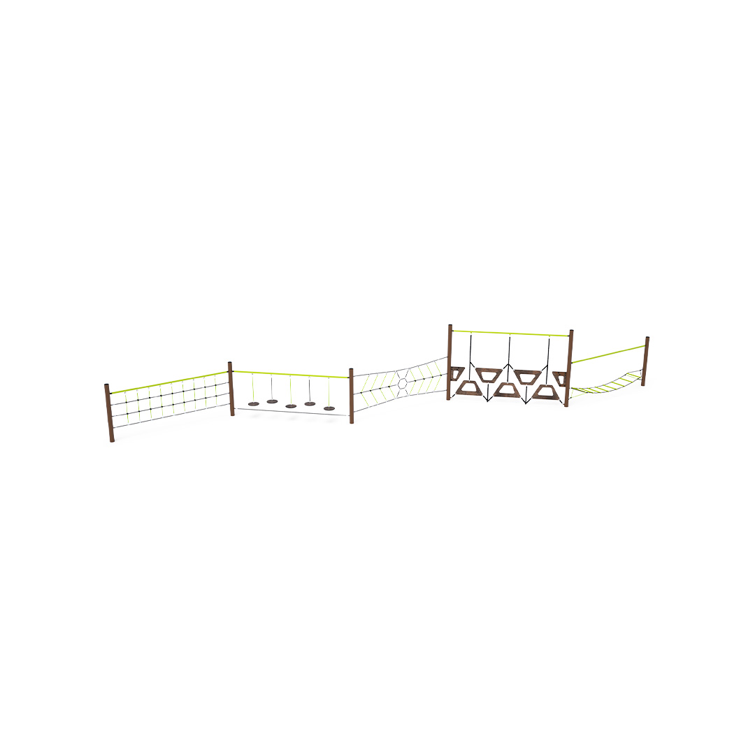 lichobežníková stena, zvislá pavúčia sieť, visiace “kamene“ a lanová sieť. Herný prvok