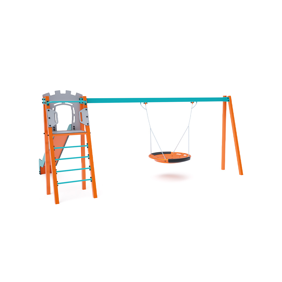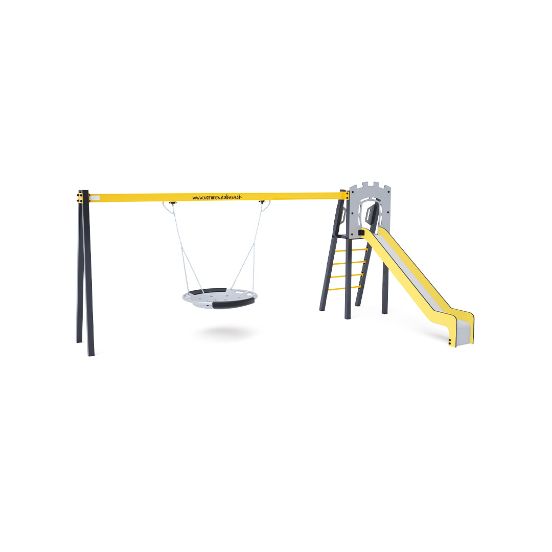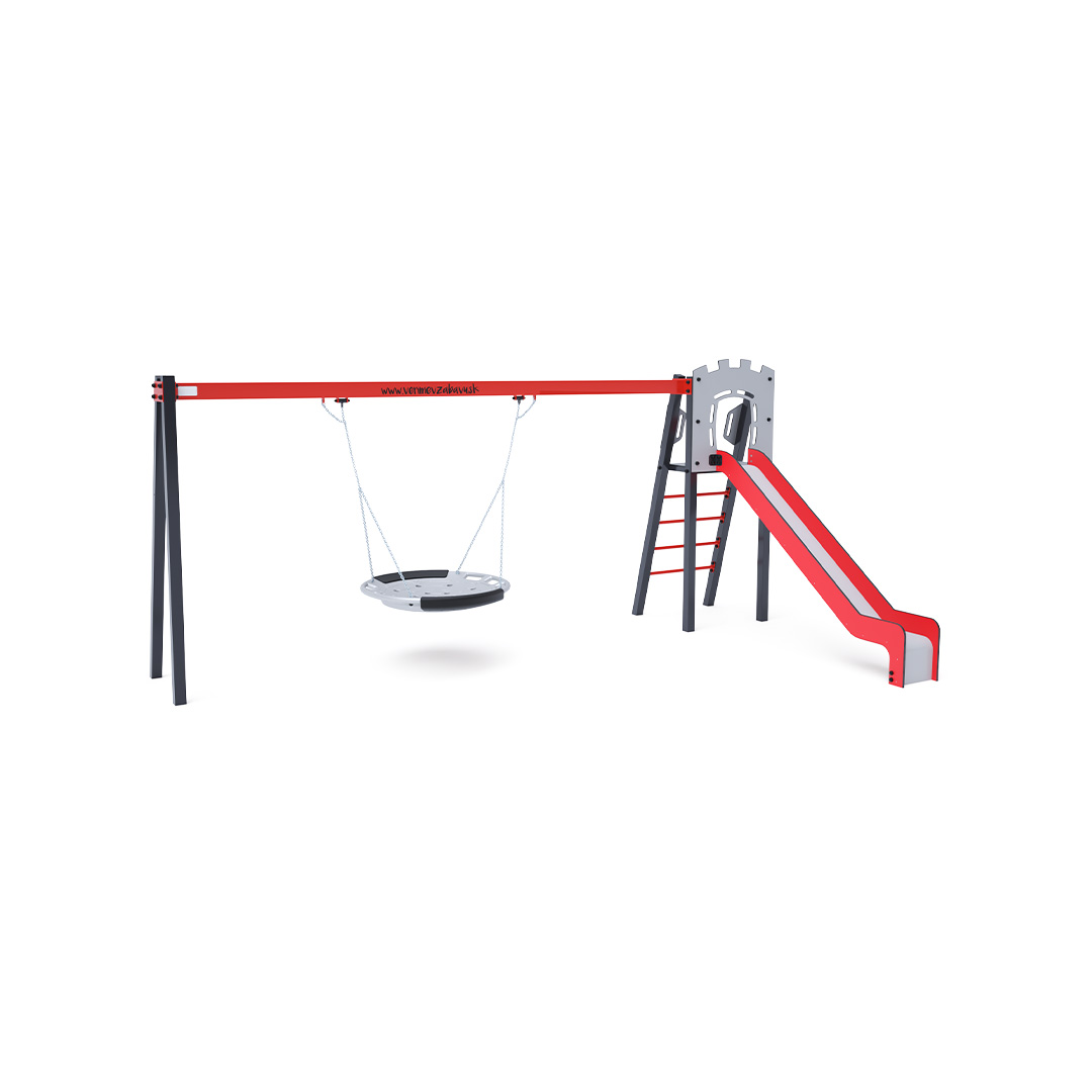 Certifikovaná bezúdržbová veža v tvare A s rebrinovým výlezom a šmykľavkou, doplnená visiacou hojdačkou s hniezdom. Hojdacie hniezdo je vhodné k hojdaniu malých detí po ležiačky alebo pre viacero detí naraz. Hniezdo má bezpečnostný záves s poistnou retiazkou. Oceľová konštrukcia je odolná voči poveternostným vplyvom vďaka zinkovaniu a lakovaniu odolnou práškovou farbou. Použitý HPL materiál a HDPE plast je chemicky odolný, odolný voči UV žiareniu - stálofarebný, netoxický, recyklovateľný a nelámavý. Nehrozí tak poranenie detí ostrými hranami alebo úlomkami. Všetky spoje sú nerezové a zakryté plastovými krytkami pre zvýšenie životnosti a bezpečnosti.