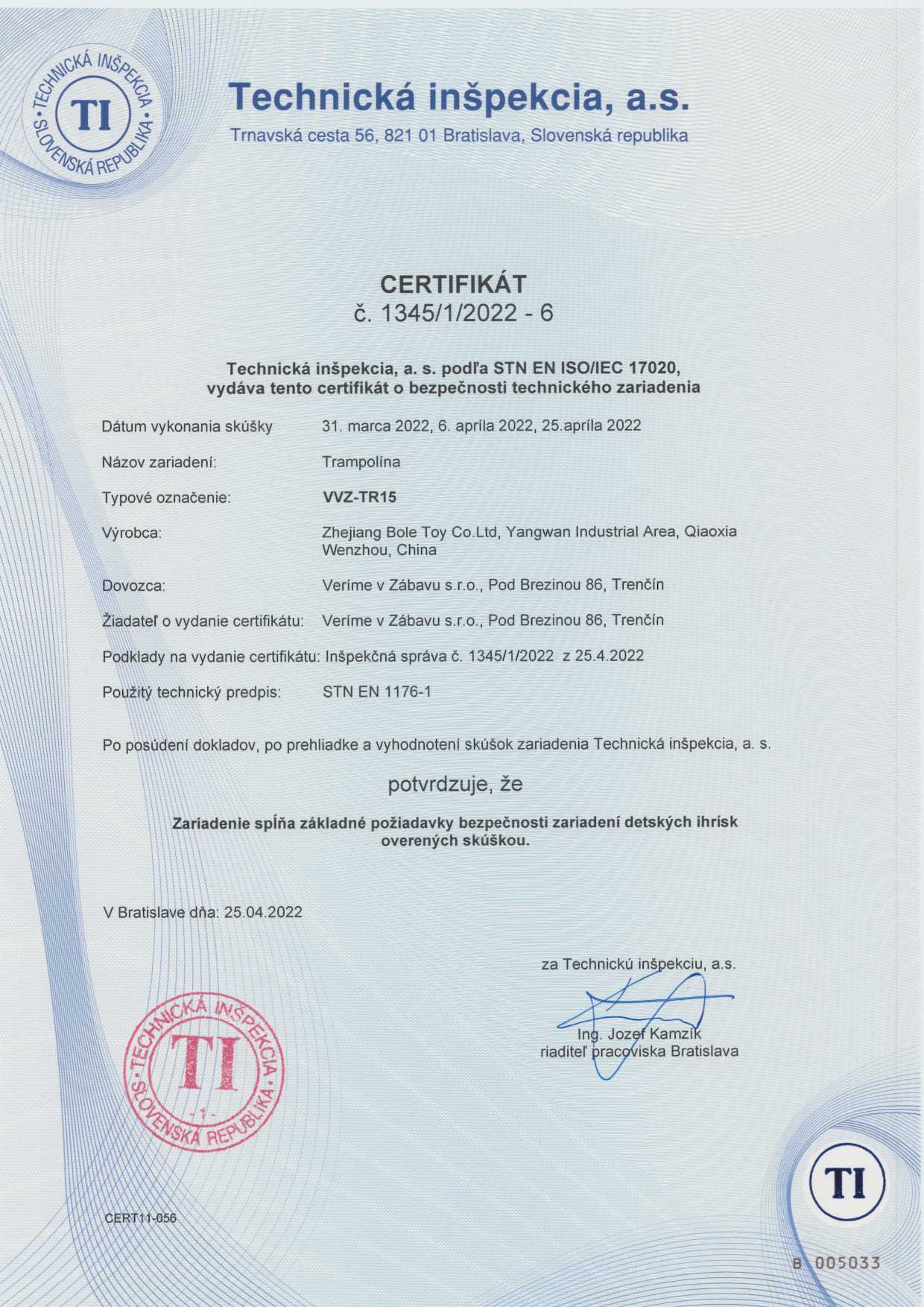 Všetky naše prvky v ponuke prešli kontrolou Technickej inšpekcie a.s., podľa príslušnej normy, čo dokazujú aj certifikáty ktoré môžete nájsť na webe pri každom produkte. Hoci sú všetky naše výrobky schválené Technickou inšpekciou a.s., najprísnejšími kontrolórmi sú pre nás tí, ktorí sa na cestu za zábavou vydajú – a nie sú to len deti.