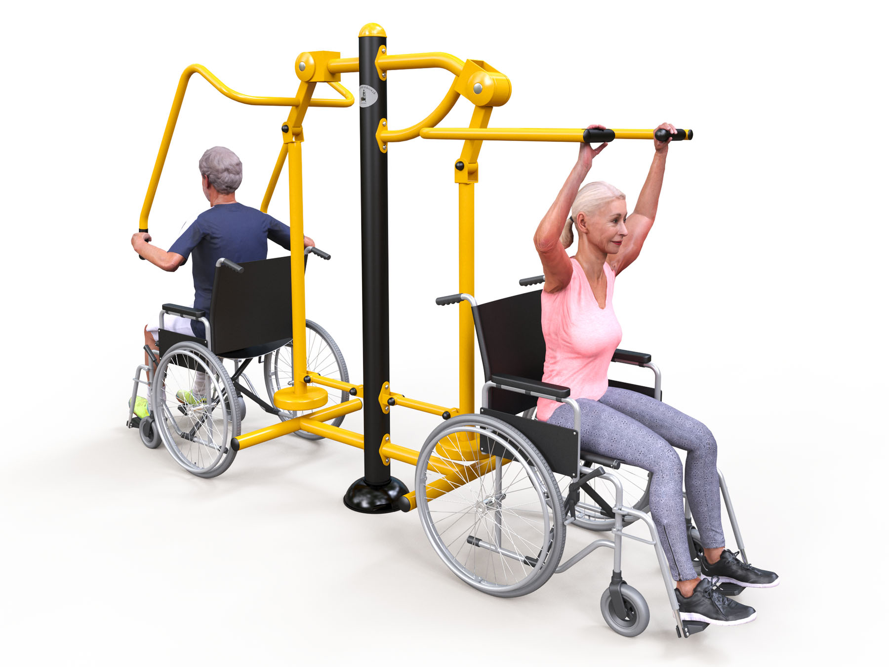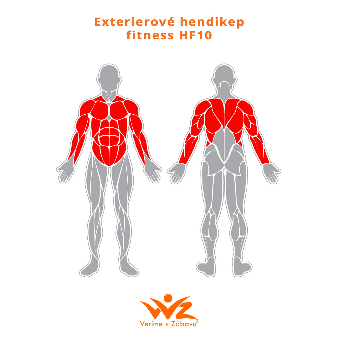 HF10 exteriérové fitness zariadenie pre hendikepovaných - slúži na precvičenie horných končatín, chrbta, ramien a brušných svalov. Minimálna potrebná plocha pre umiestnenie stroja musí mať rozmer 5000 x 3800 mm.