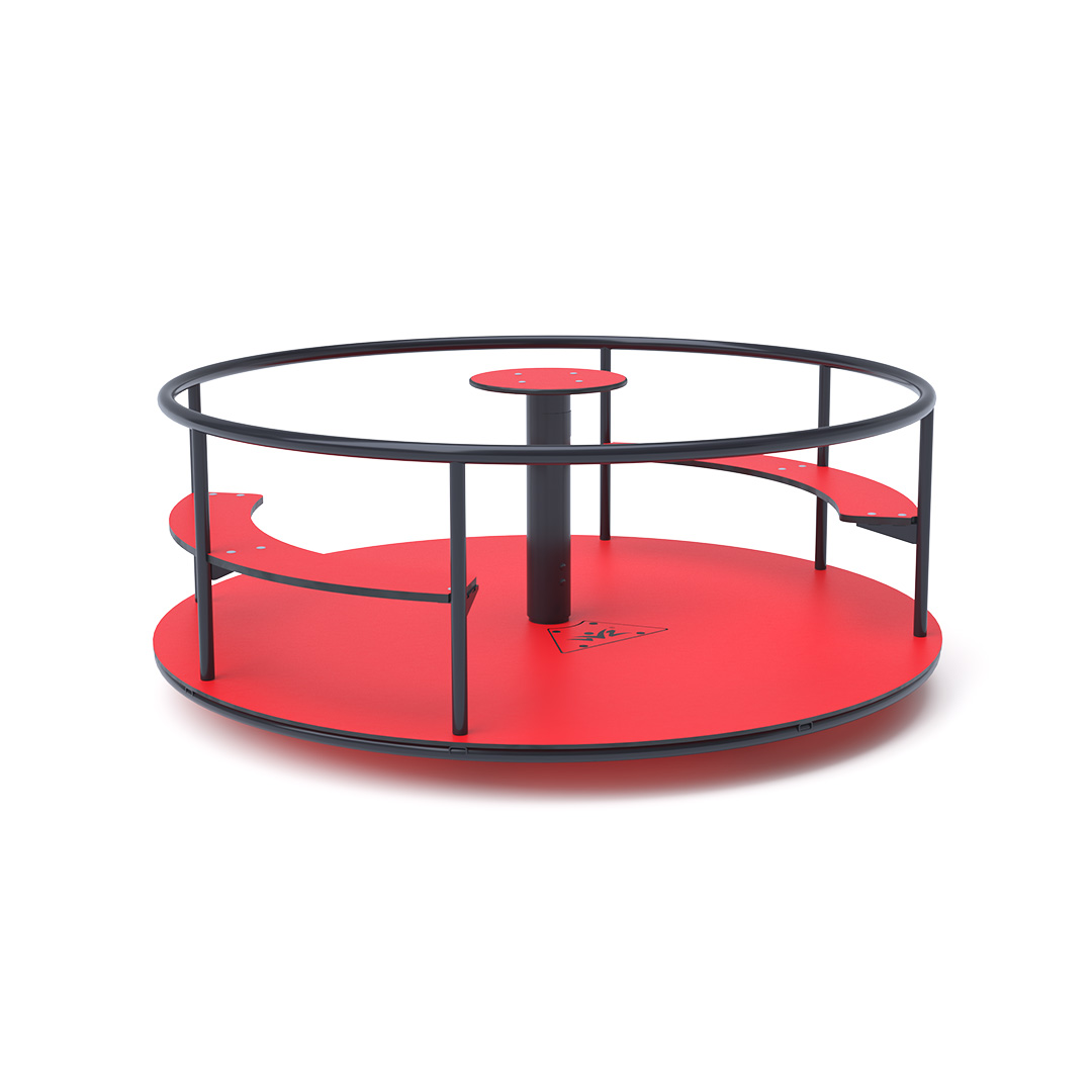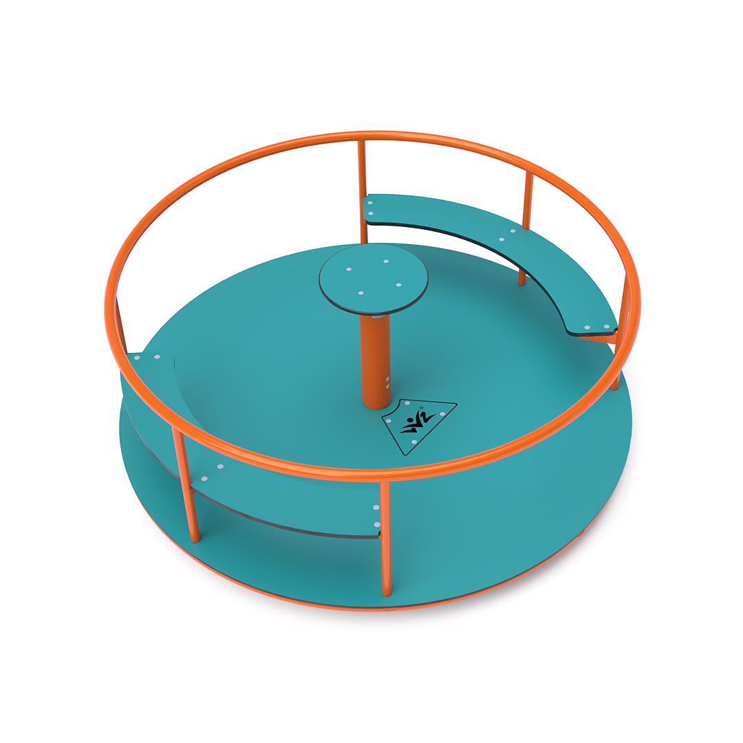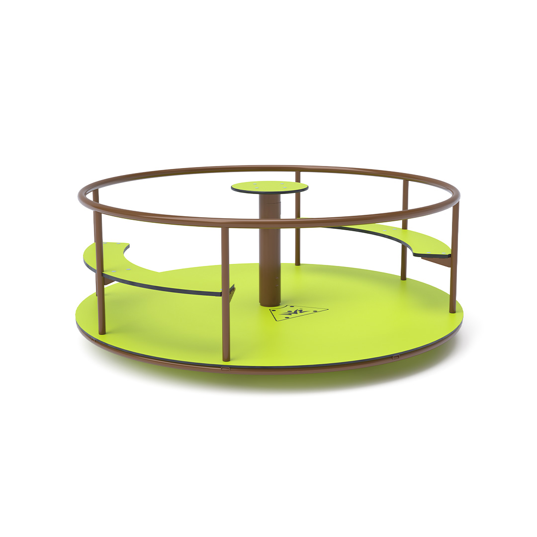 Detský kolotoč so sedákmi na sedenie je vyrobený zo žiarovo zinkovanej ocele, ktorá je upravená práškovou vypaľovacou farbou. Navrhnutý je s ohľadom na dosiahnutie dlhej životnosti a bezpečnosti prevádzky. Stredový volant, podlaha a sedáky sú vyrobené z ekologického HPL materiálu ktroý je odolný voči UV žiareniu, netoxický recyklovateľný a nelámavý. Nehrozí tak poranenie detí ostrími hranami alebo úlomkami.