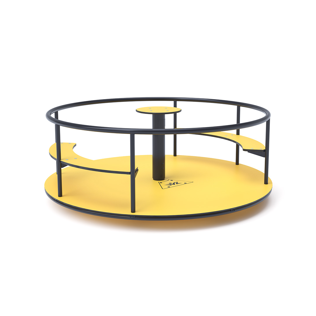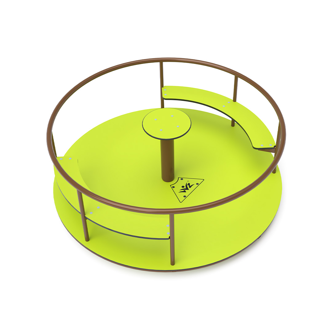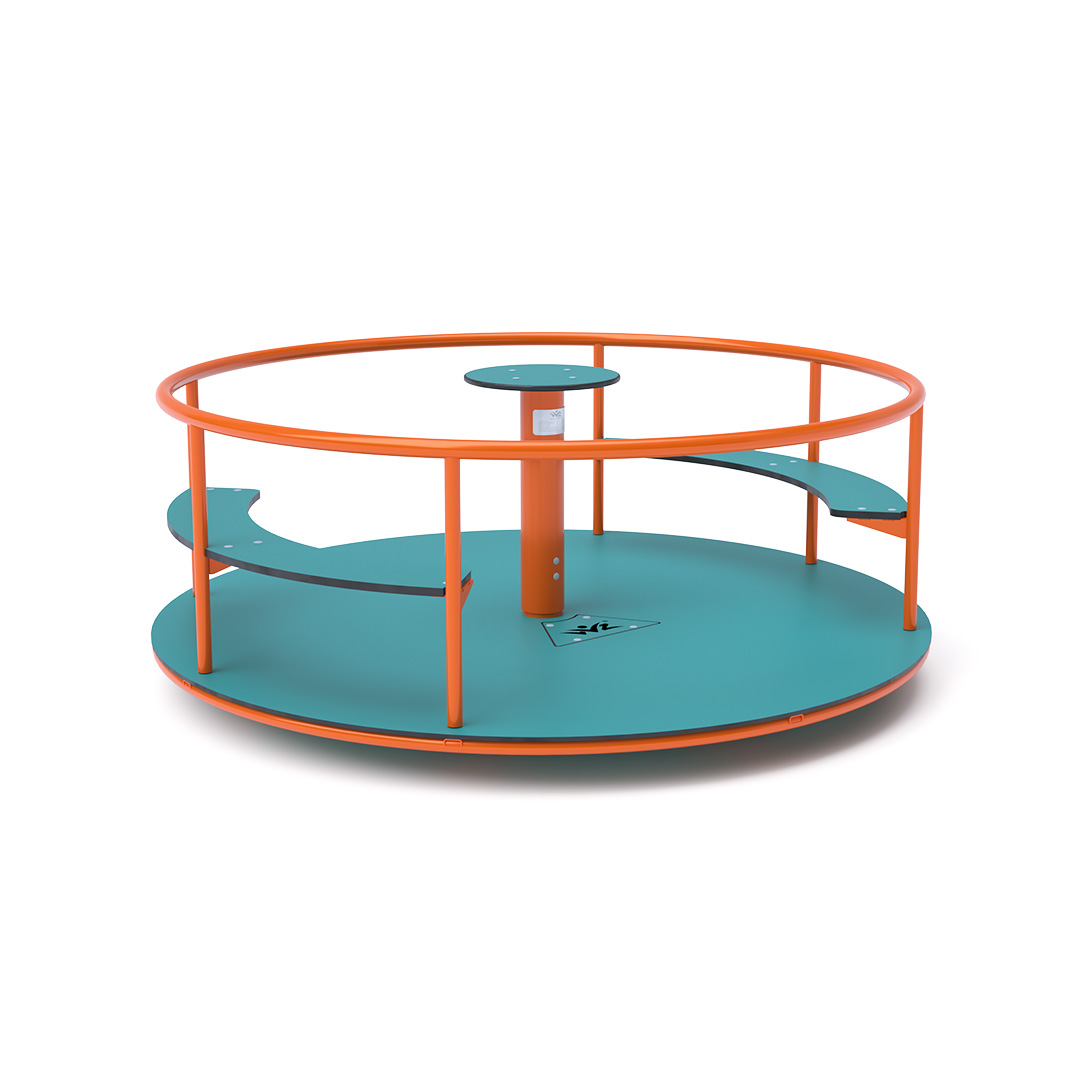 Detský kolotoč so sedákmi na sedenie je vyrobený zo žiarovo zinkovanej ocele, ktorá je upravená práškovou vypaľovacou farbou. Navrhnutý je s ohľadom na dosiahnutie dlhej životnosti a bezpečnosti prevádzky. Stredový volant, podlaha a sedáky sú vyrobené z ekologického HPL materiálu ktroý je odolný voči UV žiareniu, netoxický recyklovateľný a nelámavý. Nehrozí tak poranenie detí ostrími hranami alebo úlomkami.