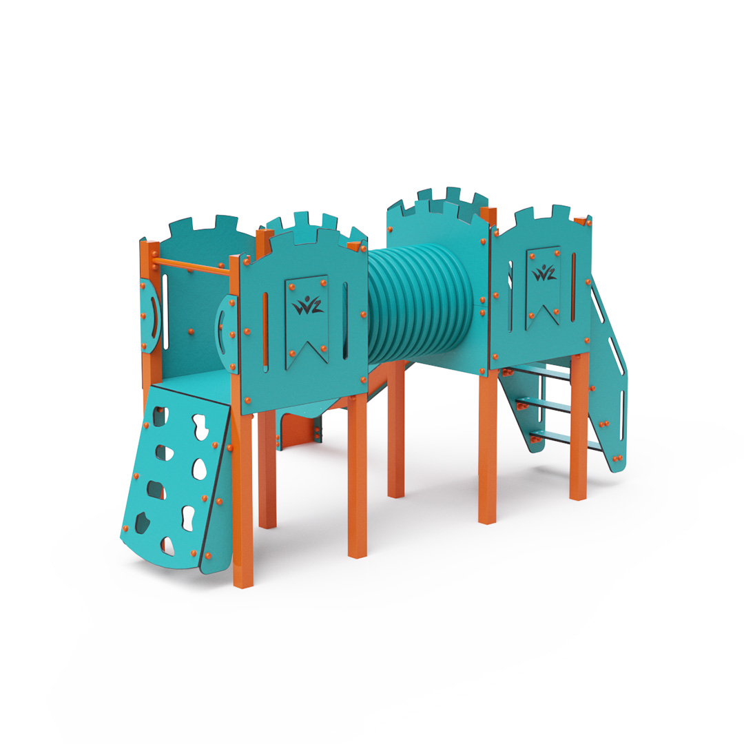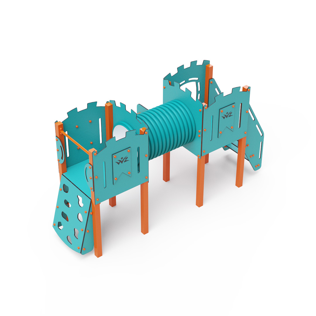 Dvojvežová kombinovaná zostava - dve veže prepojené tunelom. Na zostavu deti vylezú po schodíkoch alebo po lezeckej stene s úchytmi a dolu sa môžu spustiť po šmýkalke. Pod jednou z veží je ďalší tunel, ktorý slúži na zábavu. Tyrkysovo-oranžový dizajn už z diaľky láka ku hre. Oceľová konštrukcia je odolná voči poveternostným vplyvom vďaka žiarovému zinkovaniu a lakovaniu odolnou práškovou farbou. Použitý HPL materiál je chemicky odolný, odolný voči UV žiareniu - stálofarebný, netoxický, recyklovateľný a nelámavý. Nehrozí tak poranenie detí ostrými hranami alebo úlomkami. Všetky spoje sú nerezové a zakryté plastovými krytkami pre zvýšenie životnosti a bezpečnosti.