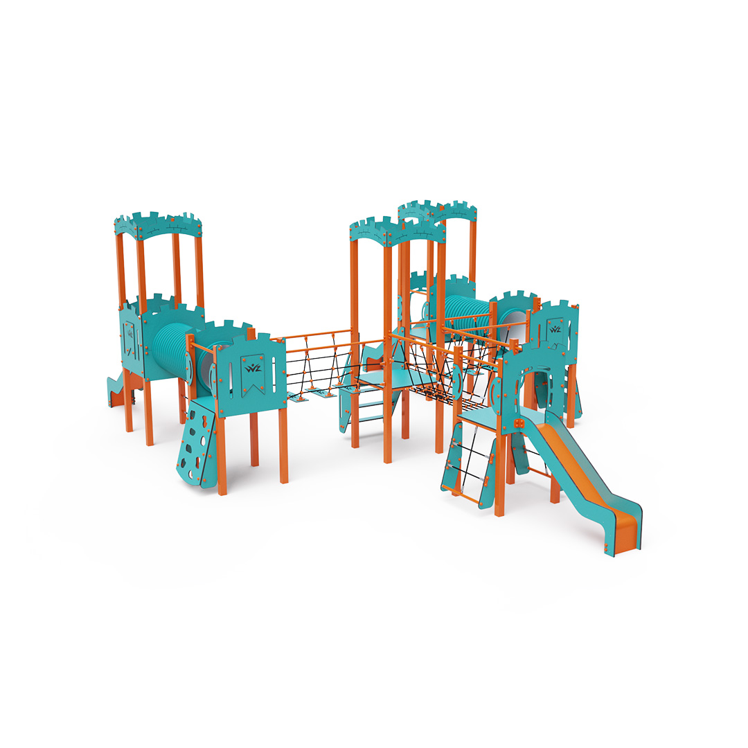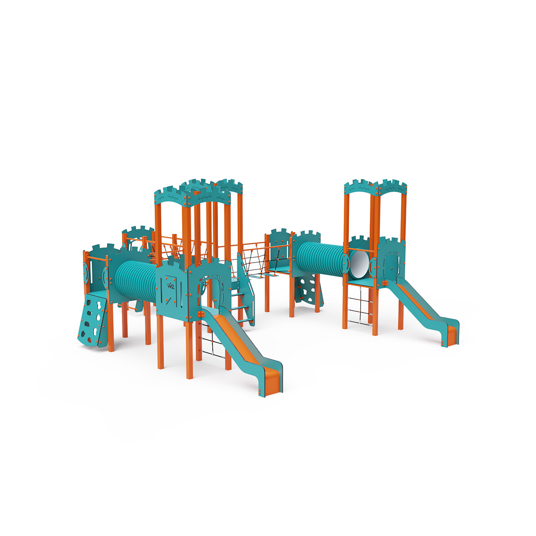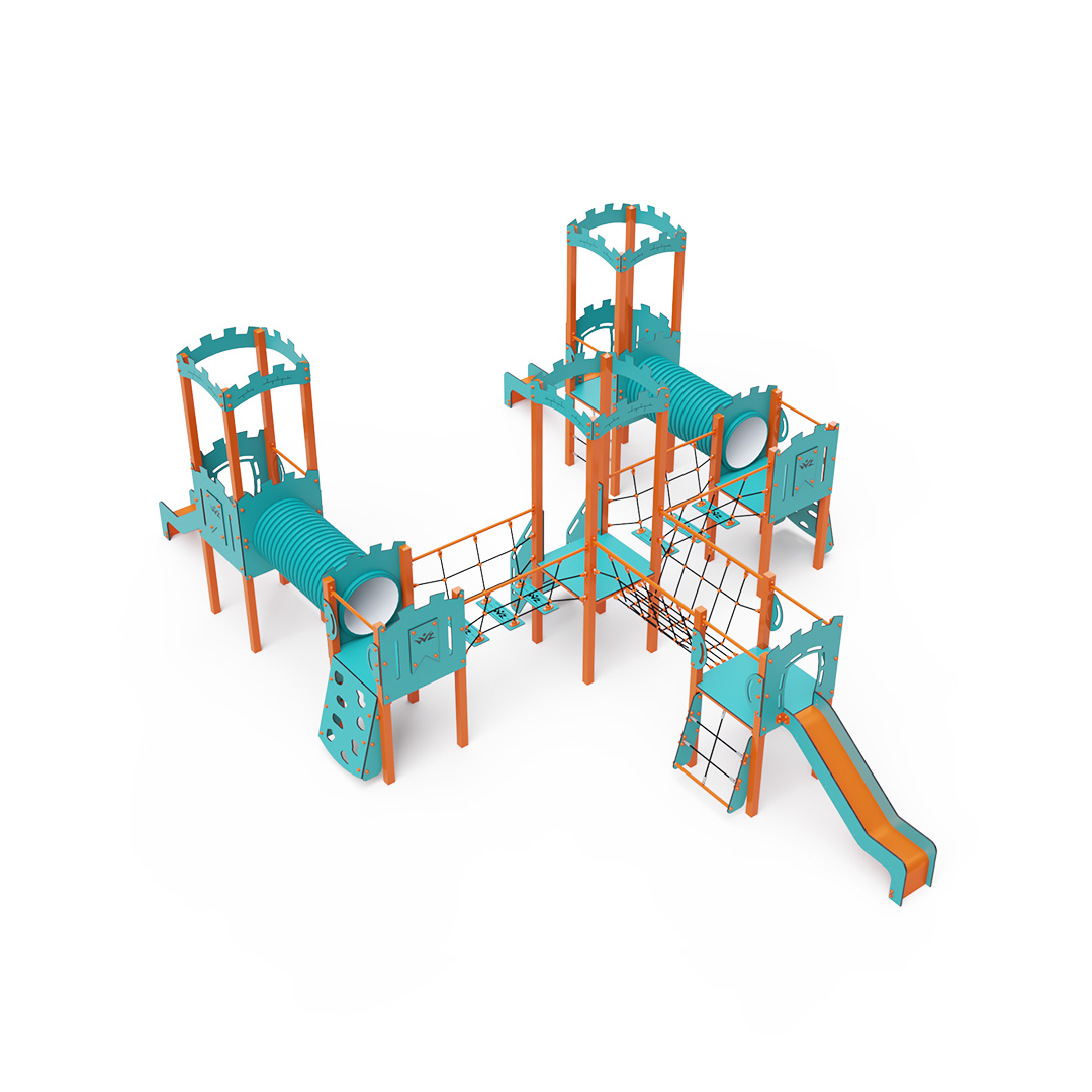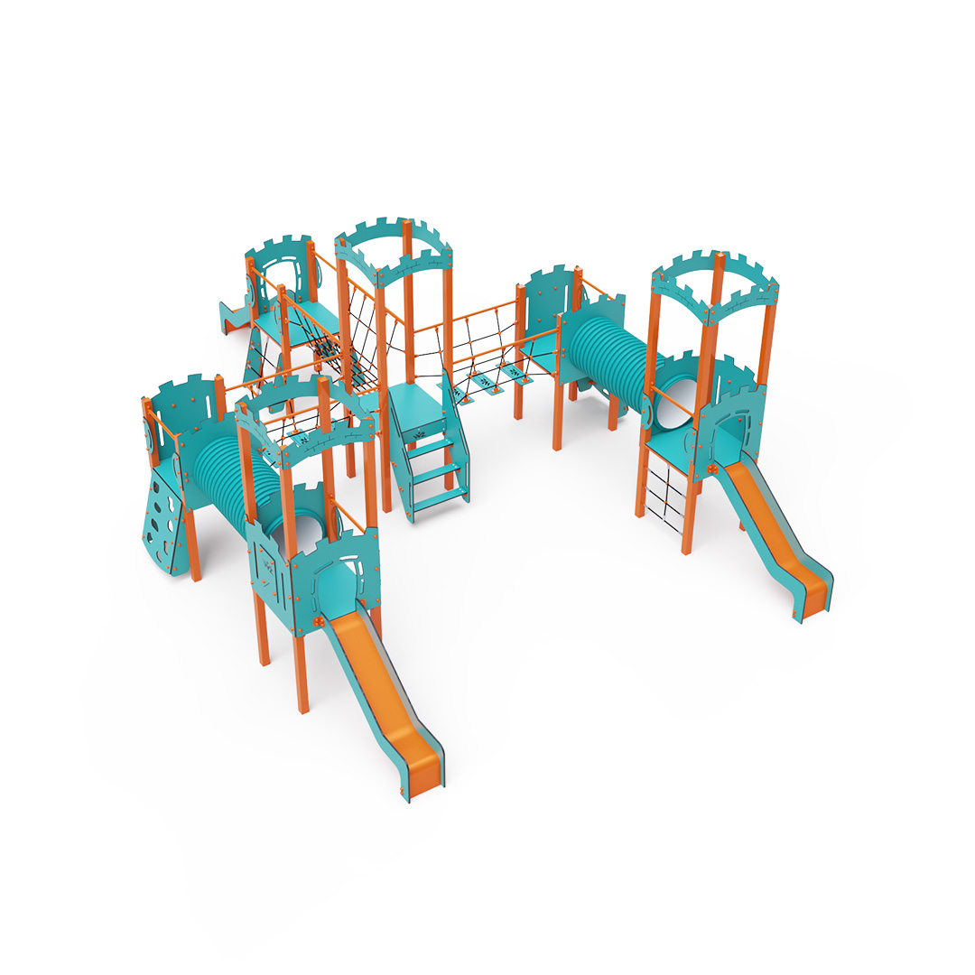 Šesťvežová kombinovaná zostava. Tri veže s hradbami a tri nízke veže sú prepojené lanovými mostíkom, lanovými balančnými mostíkmi a tunelom. Zostava obsahuje schodíky, šikmé lezecké steny, šikmé lanové siete, kolmé lanové siete a tri šmýkalky. Tyrkysovo-oranžový dizajn už z diaľky láka ku hre. Oceľová konštrukcia je odolná voči poveternostným vplyvom vďaka žiarovému zinkovaniu a lakovaniu odolnou práškovou farbou. Použitý HPL materiál je chemicky odolný, odolný voči UV žiareniu - stálofarebný, netoxický, recyklovateľný a nelámavý. Nehrozí tak poranenie detí ostrými hranami alebo úlomkami. Laná sú vyrobené z polyesterových vlákien, ktoré sú vinuté okolo stredovej výstuže. Táto konštrukcia lana zvyšuje jeho pevnosť a odolnosť proti mechanickému namáhaniu. Samotný polyester je odolný voči mikroorganizmom, poveternostným vplyvom, rýchlo schne po daždi, je stálofarebný a vyznačuje sa vysokou pevnosťou. Všetky spoje sú nerezové a zakryté plastovými krytkami pre zvýšenie životnosti a bezpečnosti.