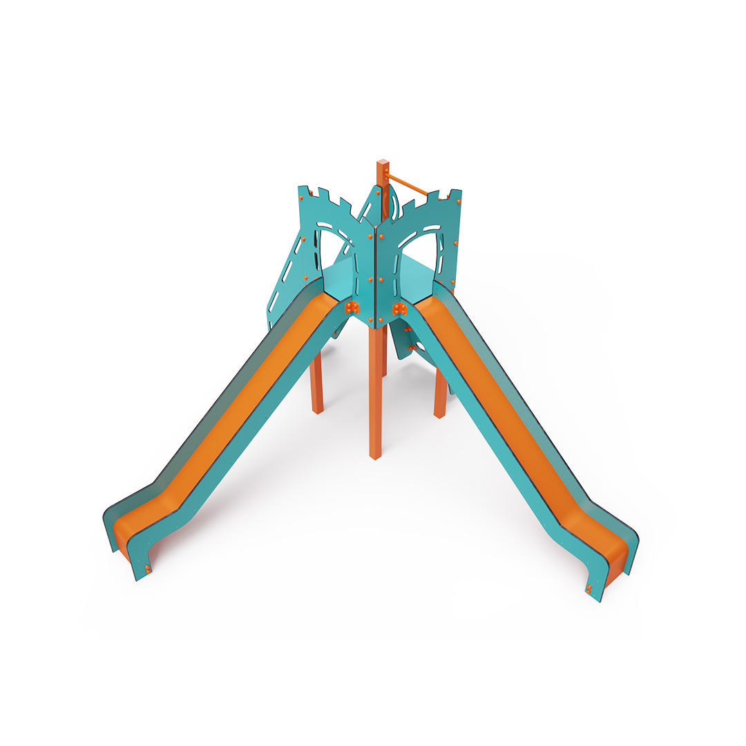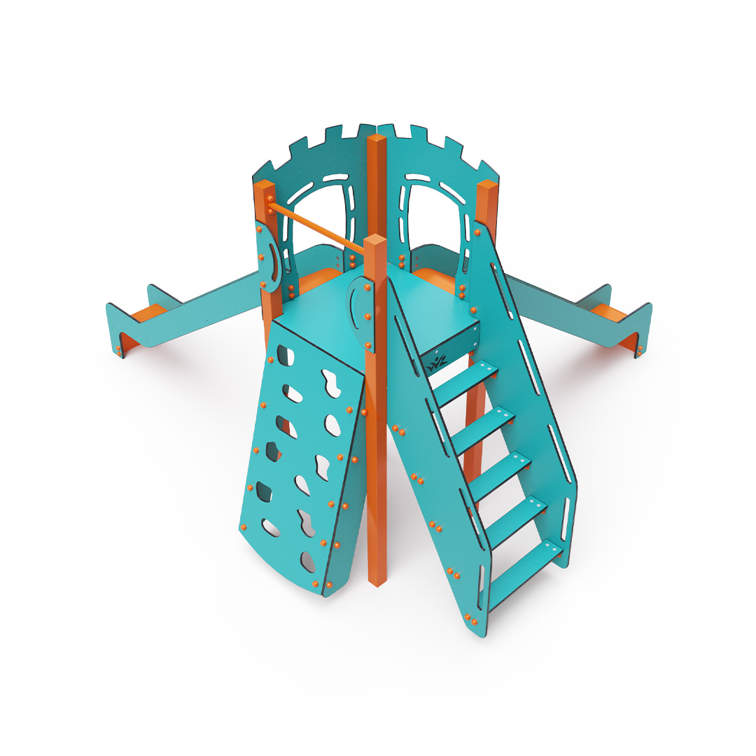 lezeckej stene s úchytmi a dolu sa môžu spustiť po jednej z dvoch šmýkaliek. Tyrkysovo-oranžový dizajn už z diaľky láka ku hre. Oceľová konštrukcia je odolná voči poveternostným vplyvom vďaka žiarovému zinkovaniu a lakovaniu odolnou práškovou farbou. Použitý HPL materiál je chemicky odolný, odolný voči UV žiareniu - stálofarebný, netoxický, recyklovateľný a nelámavý. Nehrozí tak poranenie detí ostrými hranami alebo úlomkami. Všetky spoje sú nerezové a zakryté plastovými krytkami pre zvýšenie životnosti a bezpečnosti.