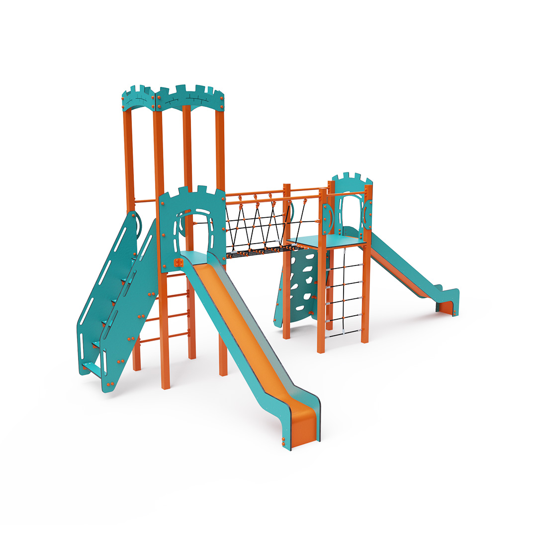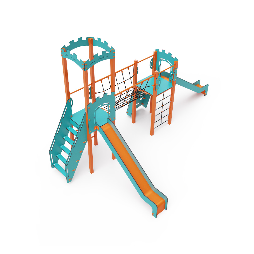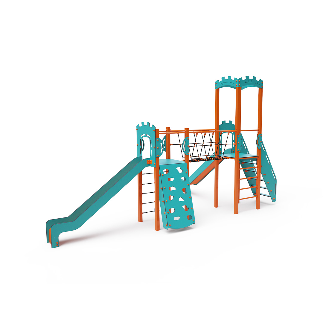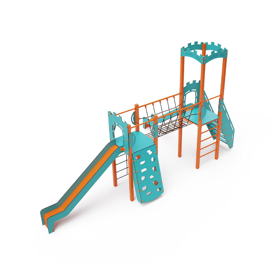 Dvojvežová kombinovaná zostava - dve veže prepojené lanovým balančným mostíkom. Na zostavu deti vylezú po lezeckej stene s úchytmi, po rebríku, lanovej sieti alebo po schodíkoch a dolu sa môžu spustiť po jednej z dvoch šmýkaliek. Tyrkysovo-oranžový dizajn už z diaľky láka ku hre. Oceľová konštrukcia je odolná voči poveternostným vplyvom vďaka žiarovému zinkovaniu a lakovaniu odolnou práškovou farbou. Použitý HPL materiál je chemicky odolný, odolný voči UV žiareniu - stálofarebný, netoxický, recyklovateľný a nelámavý.