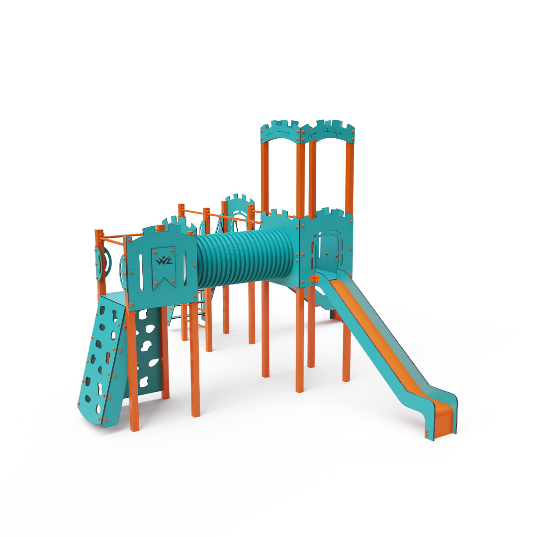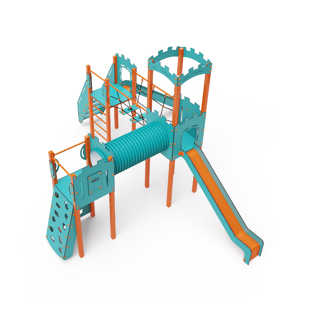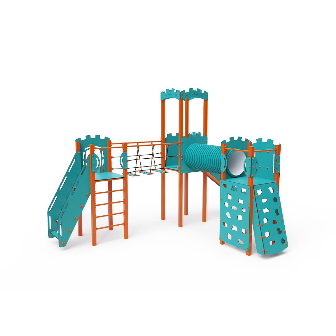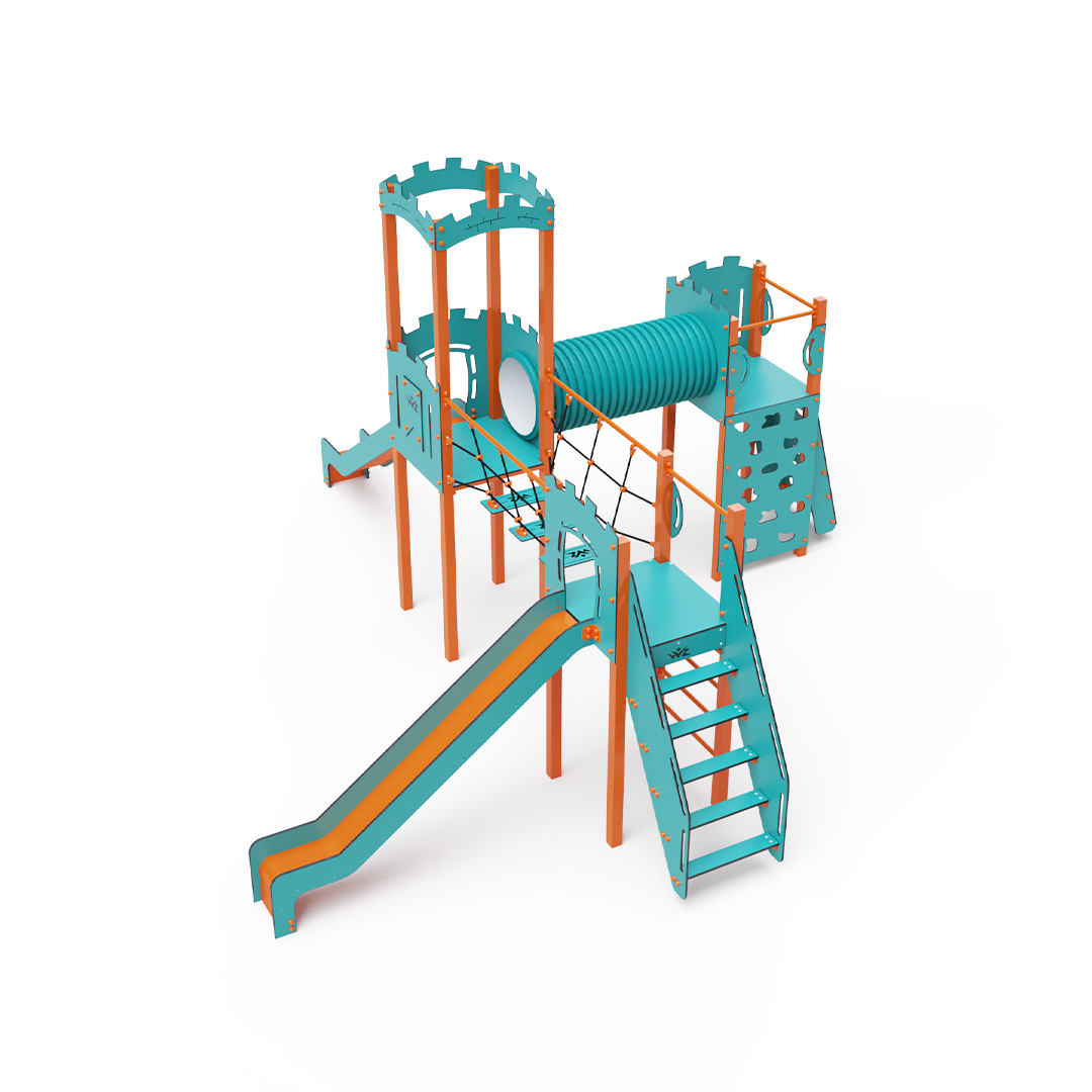 Trojvežová kombinovaná zostava v tvare písmena L. Dve veže sú prepojené so strednou vežou s hradbami lanovým balančným mostíkom a tunelom. Na zostavu deti vylezú po schodíkoch, po šikmej lezeckej stene s úchytmi alebo po rebríku a dolu sa môžu spustiť po jednej z dvoch šmýkaliek. Tyrkysovo-oranžový dizajn už z diaľky láka ku hre. Oceľová konštrukcia je odolná voči poveternostným vplyvom vďaka žiarovému zinkovaniu a lakovaniu odolnou práškovou farbou. Použitý HPL materiál je chemicky odolný, odolný voči UV žiareniu - stálofarebný, netoxický, recyklovateľný a nelámavý. Nehrozí tak poranenie detí ostrými hranami alebo úlomkami. Laná sú vyrobené z polyesterových vlákien, ktoré sú vinuté okolo stredovej výstuže. Táto konštrukcia lana zvyšuje jeho pevnosť a odolnosť proti mechanickému namáhaniu. Samotný polyester je odolný voči mikroorganizmom, poveternostným vplyvom, rýchlo schne po daždi, je stálofarebný a vyznačuje sa vysokou pevnosťou. Všetky spoje sú nerezové a zakryté plastovými krytkami pre zvýšenie životnosti a bezpečnosti.