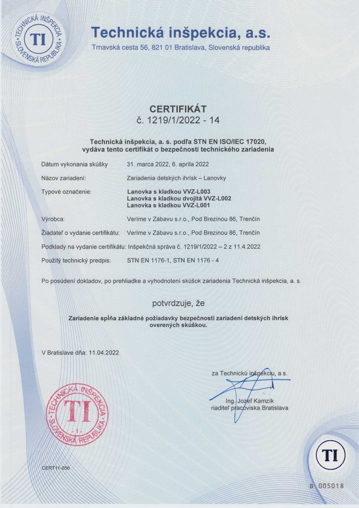Všetky naše prvky v ponuke prešli kontrolou Technickej inšpekcie a.s., podľa príslušnej normy, čo dokazujú aj certifikáty ktoré môžete nájsť na webe pri každom produkte. Hoci sú všetky naše výrobky schválené Technickou inšpekciou a.s., najprísnejšími kontrolórmi sú pre nás tí, ktorí sa na cestu za zábavou vydajú – a nie sú to len deti.