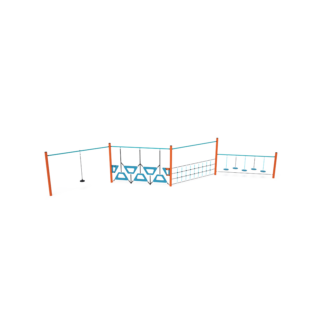 Opičia dráha vytvorená kombináciou štyroch častí - voľne zaveseného disku, lichobežníkovej steny, lanovej steny s pomocnou tyčou a voľne zavesených diskov. Herný prvok je vyrobený zo zinkovanej ocele s kvalitnou povrchovou úpravou - práškovým lakovaním , spoje sú nerezové a zakryté plastovými krytkami pre zvýšenie bezpečnosti a životnosti spojov. Laná sú vyrobené z polyesterových vlákien s oceľovým jadrom, ktoré sú vinuté okolo stredu. Táto konštrukcia lana zvyšuje jeho pevnosť a odolnosť proti mechanickému namáhaniu. Samotný polyester má veľa kladných vlastností. Je odolný voči mikroorganizmom, poveternostným vplyvom, rýchlo schne po daždi, je stálofarebný a vyznačuje sa vysokou pevnosťou.