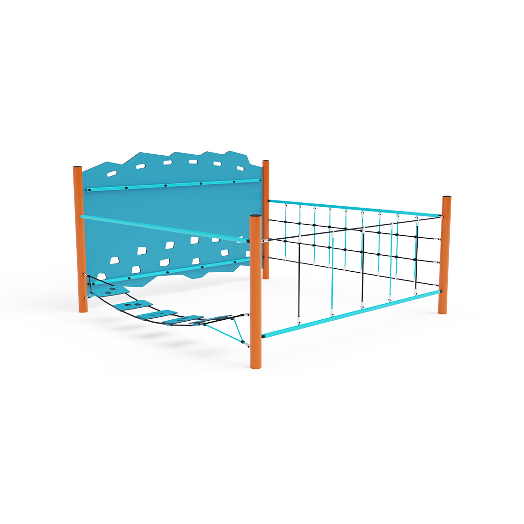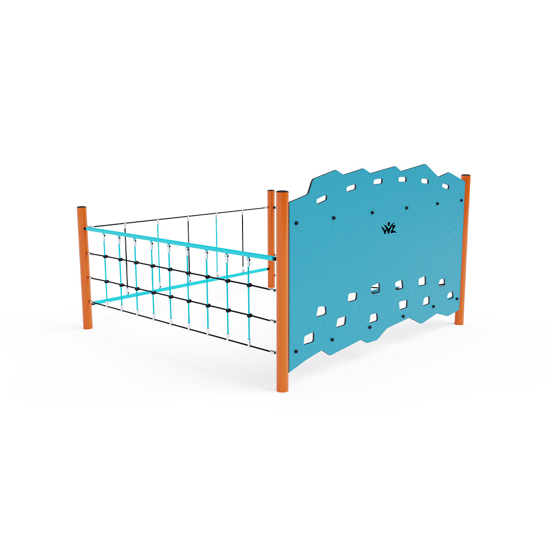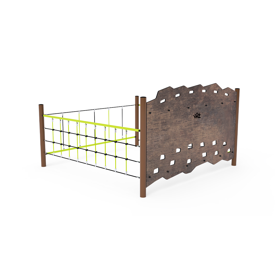 strán. Časť je vytvorená zvislou lanovou sieťou preverí silu rúk každého dieťaťa. Časť vytvorená zvislou stenou. Časť vytvorená balančnými nášlapmi z HPL, ktoré nielen vytrénujú detský balans ale aj naučia deti aké stopy zanechávajú rôzne zvieratá. Herný prvok je vyrobený zo žiarovo zinkovanej ocele s kvalitnou povrchovou úpravou, spoje sú nerezové a zakryté plastovými krytkami pre zvýšenie bezpečnosti a životnosti spojov. Laná sú vyrobené z polyesterových vlákien, ktoré sú vinuté okolo stredu. Táto konštrukcia lana zvyšuje jeho pevnosť a odolnosť proti mechanickému namáhaniu. Samotný polyester má veľa kladných vlastností. Je odolný voči mikroorganizmom, poveternostným vplyvom, rýchlo schne po daždi, je stálofarebný a vyznačuje sa vysokou pevnosťou.