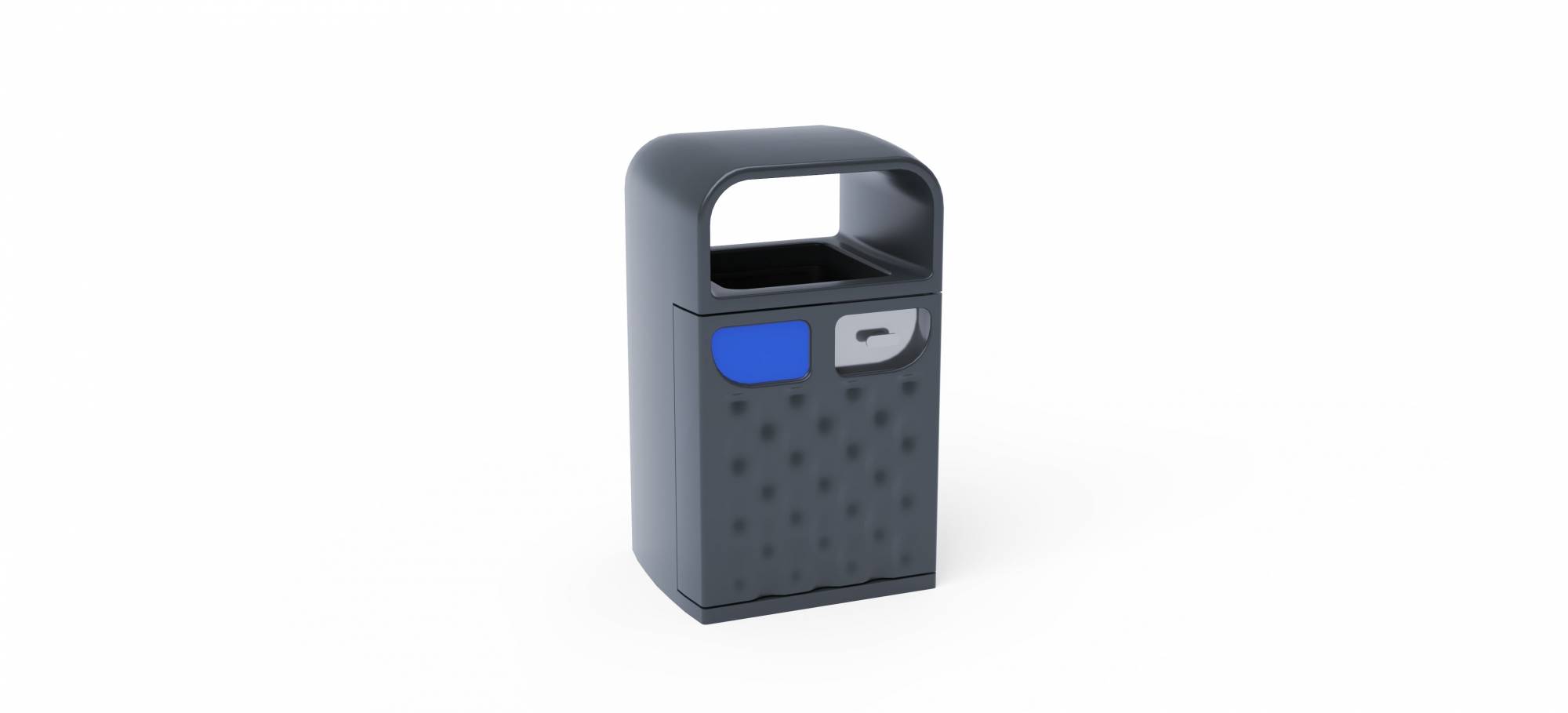 Dizajnový odpadkový kôš s krytom označníkom a popolníkom s objemom 90l vhodný nielen do exteriéru - parky, ihriská, ale aj do interiéru - nákupné centrá, letiskové haly, vstupné haly a pod. Kôš je možné označiť pre separáciu odpadu štítkom. Prístup k vložke je zabezpečený cez predné dvierka s bezpečnostným zámkom. Súčasťou dvierok je nerezový popolník, ktorý sa dá skryť v prípade potreby (pre priestory zo zákazom fajčenia).