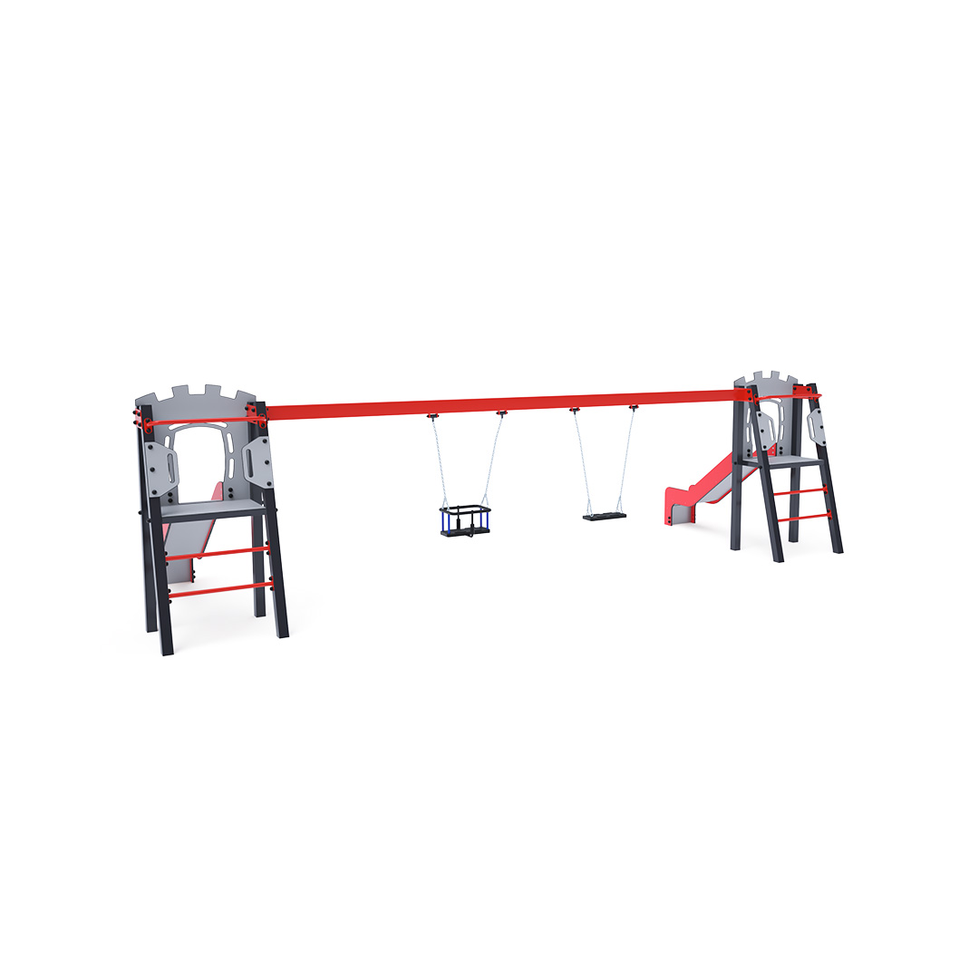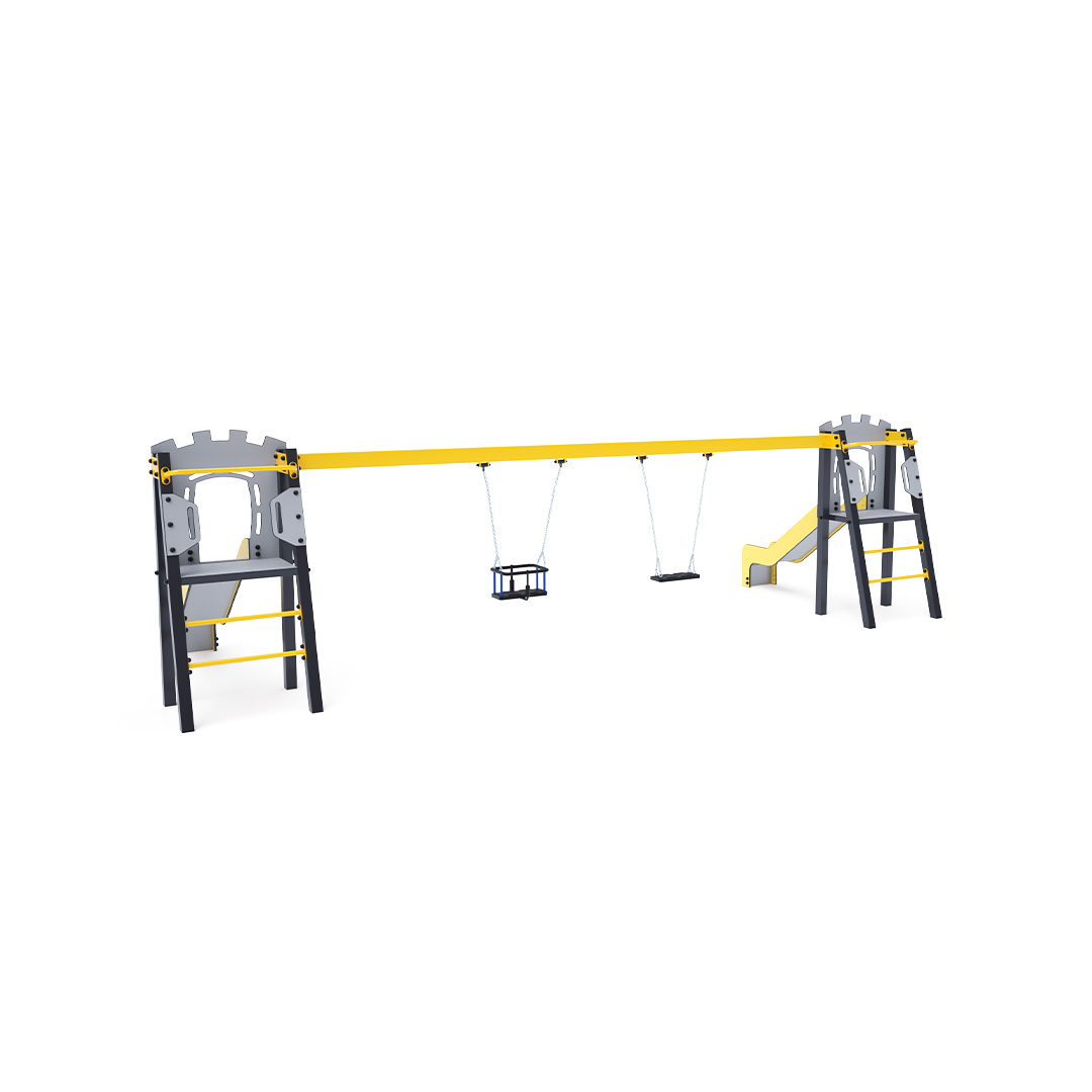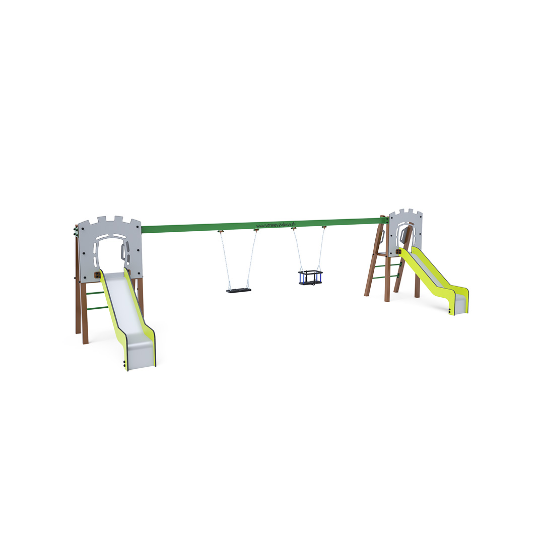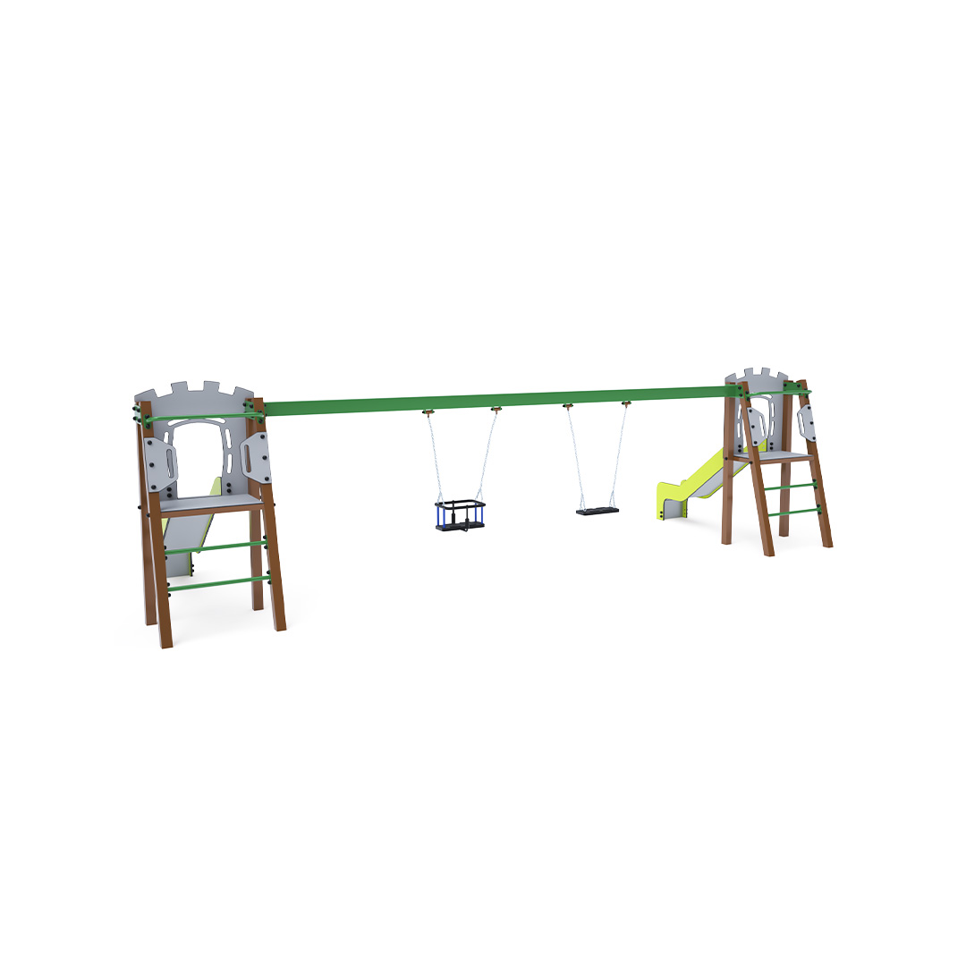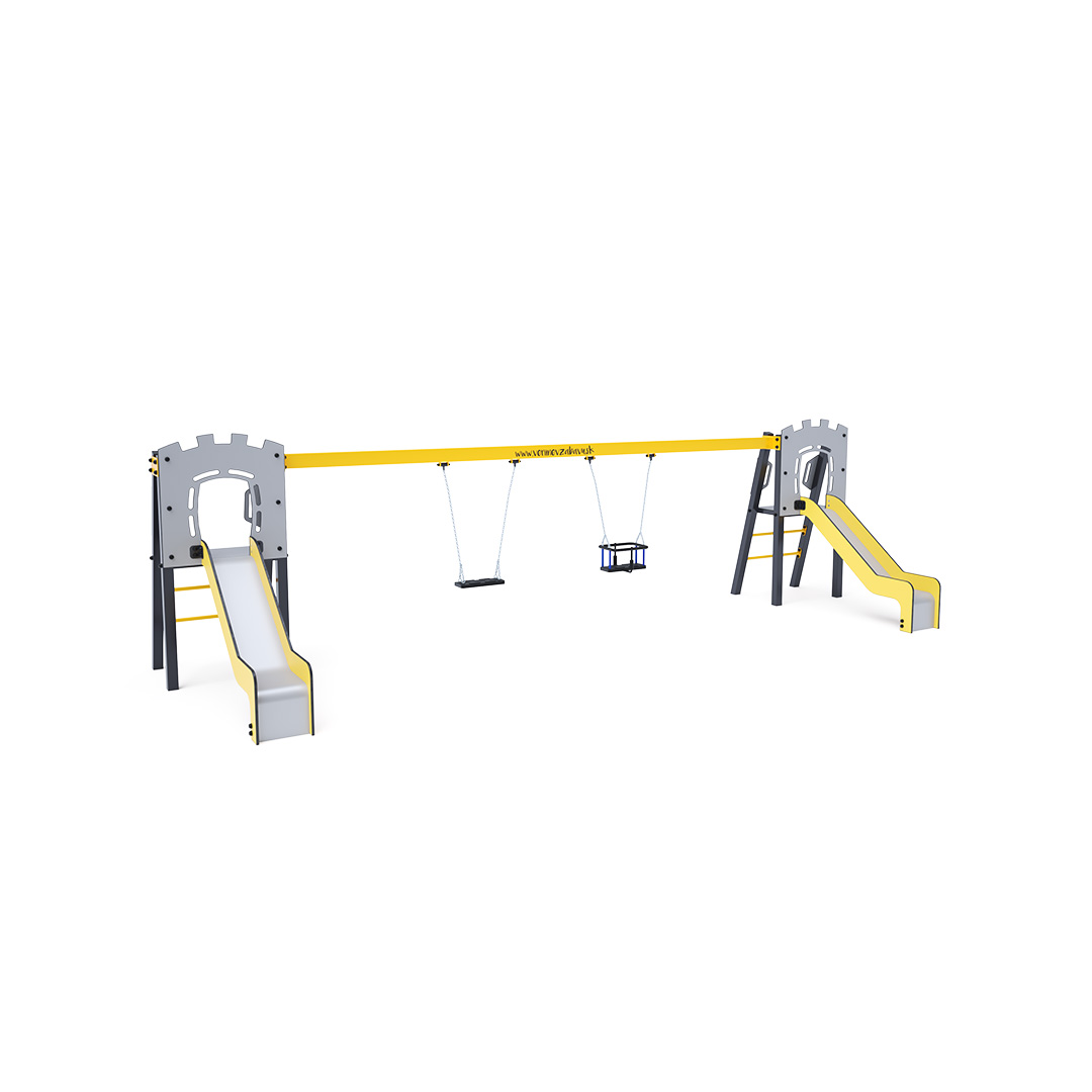 Dve certifikované bezúdržbové veže v tvare A s rebrinovým výlezom a šmykľavkou, doplnená visiacou hojdačkou. Môžete si vybrať klasický alebo baby sedák. Baby sedák obsahuje ohrádku s priečkou medzi nohami dieťaťa, ktorá zabraňuje zosunutiu alebo spadnutiu. Zároveň sa dieťa môže oprieť. Oceľová konštrukcia je odolná voči poveternostným vplyvom vďaka zinkovaniu a lakovaniu odolnou práškovou farbou. Použitý HPL materiál a HDPE plast je chemicky odolný, odolný voči UV žiareniu - stálofarebný, netoxický, recyklovateľný a nelámavý. Nehrozí tak poranenie detí ostrými hranami alebo úlomkami.