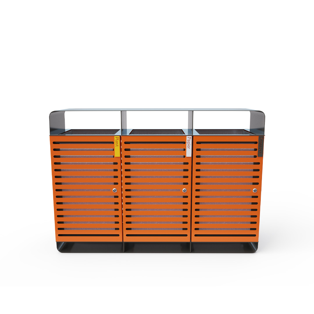 Dizajnový odpadkový kôš s krytom s objemom 3x60l vhodný nielen do exteriéru - parky, ihriská, ale aj do interiéru - nákupné centrá, letiskové haly, vstupné haly a pod.