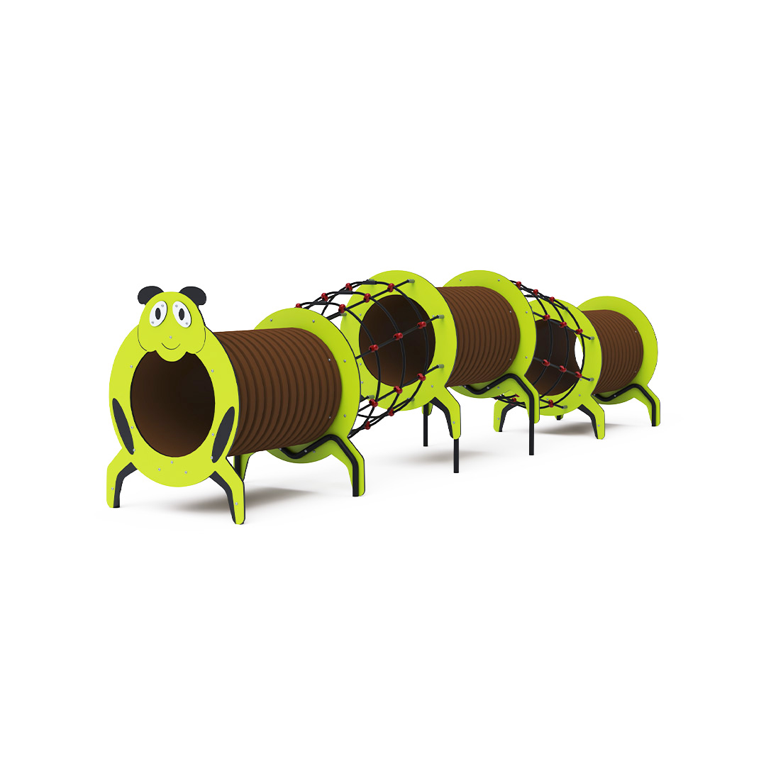 Herný prvok v designe húsenice s plastovým tunelom je našim veľkým prevedením tejto série herných prvkov. Herná zostava je zložená z troch tunelov v dvoch výškach ktoré sú spojené dvoma lanovými tunelmi. Tematické prevedenie podporuje detskú fantáziu. Panely prednej a zadnej grafiky sú vyrobené z HPL materiálu, ktorý je zárukou dlhej životnosti, stálofarebnosti a bezpečnosti. HPL materiál je ekologický, chemicky odolný, odolný voči UV žiareniu, netoxický, recyklovateľný a nelámavý. Nehrozí tak poranenie detí ostrými hranami alebo úlomkami. Laná sú vyrobené z polyesterových vlákien, ktoré sú vinuté okolo stredu. Táto konštrukcia lana zvyšuje jeho pevnosť a odolnosť proti mechanickému namáhaniu. Samotný polyester má veľa kladných vlastností. Je odolný voči mikroorganizmom, poveternostným vplyvom, rýchlo schne po daždi, je stálofarebný a vyznačuje sa vysokou
